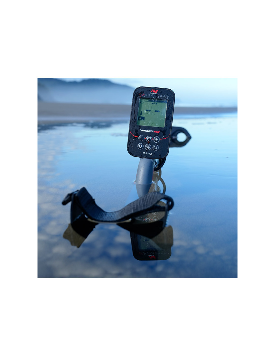 Le Minelab Vanquish 560 est le Multi-IQ le plus complet : étanche IP68 (5 m), livré avec le grand disque V12X, 5 tons + volume fer réglable, idéal pour terre, plage et eau.